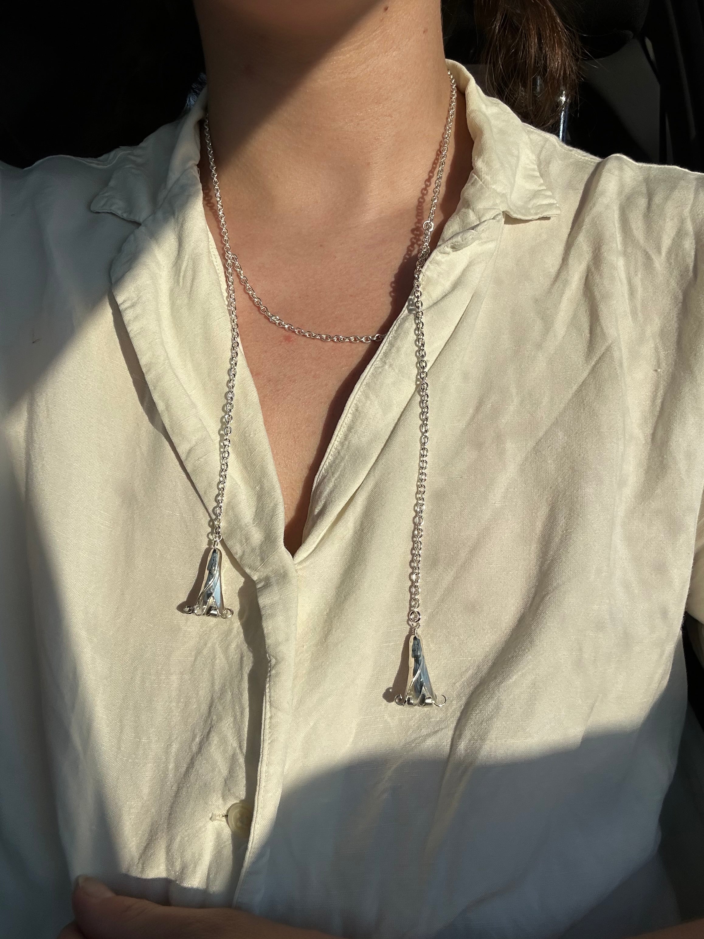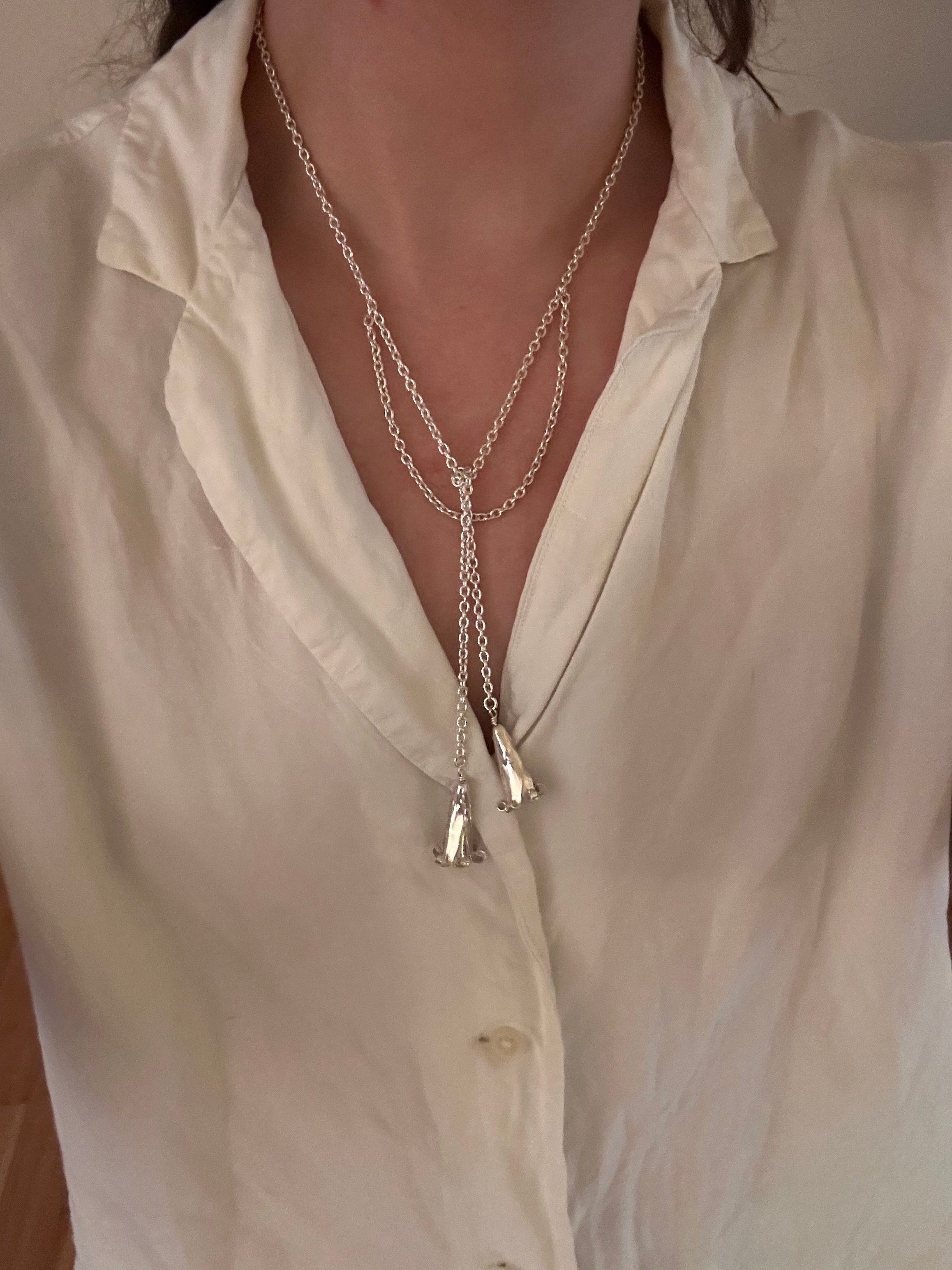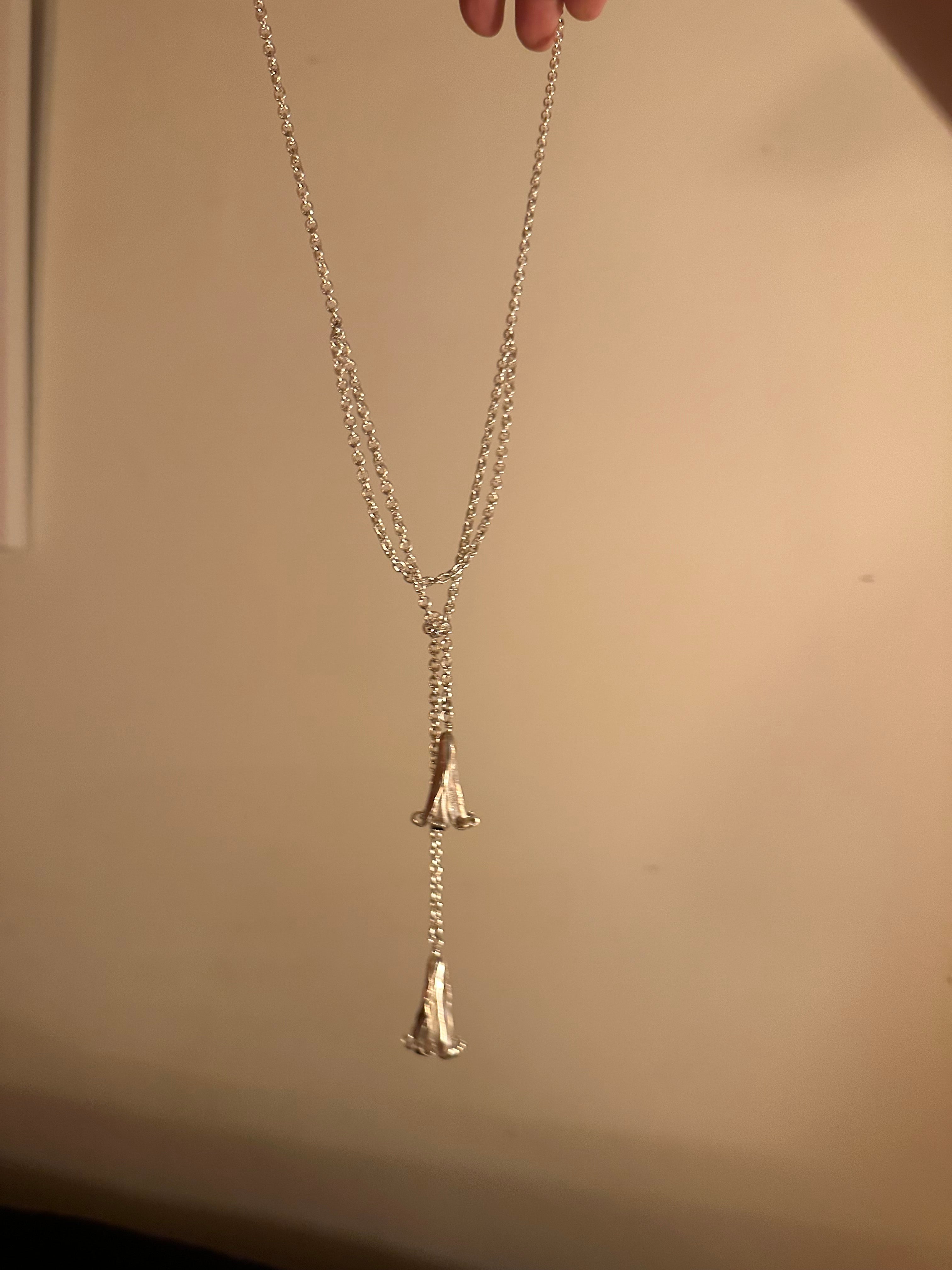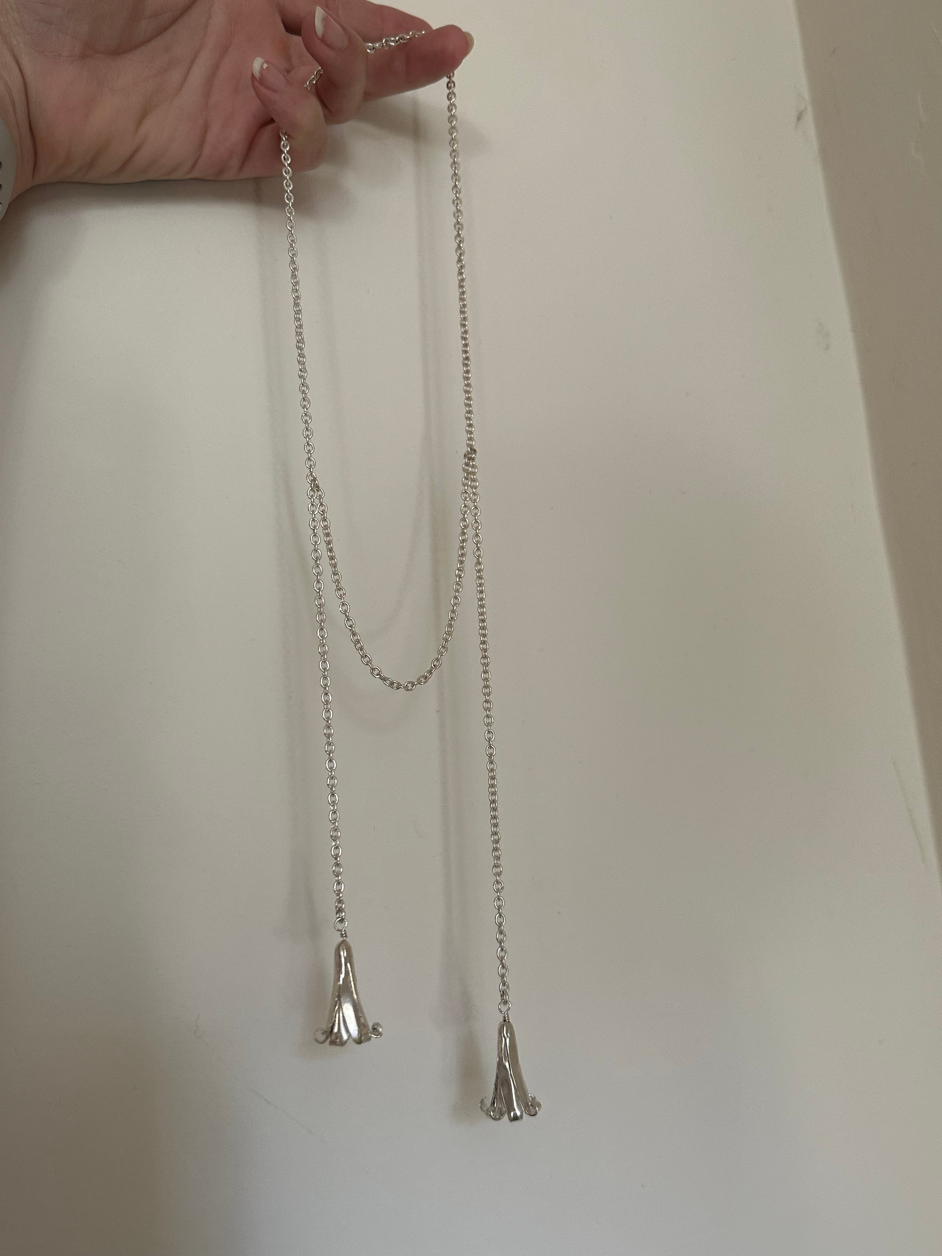 3mm sterling silver cable chain measures 18” with the longest flower dangling at 24”