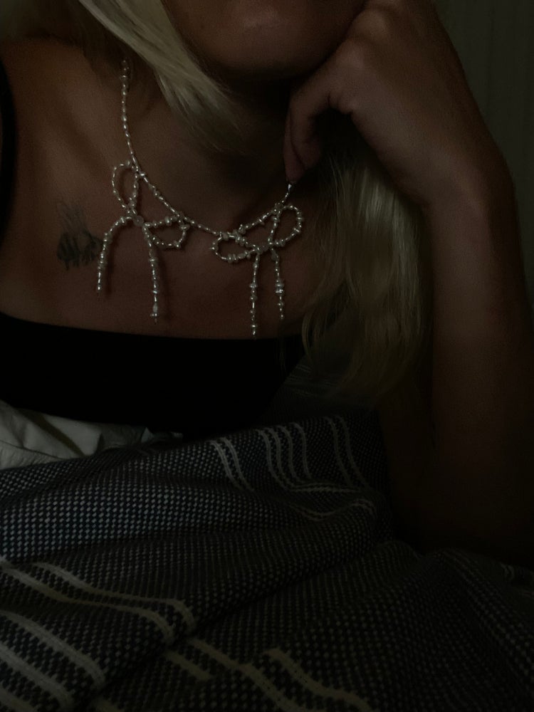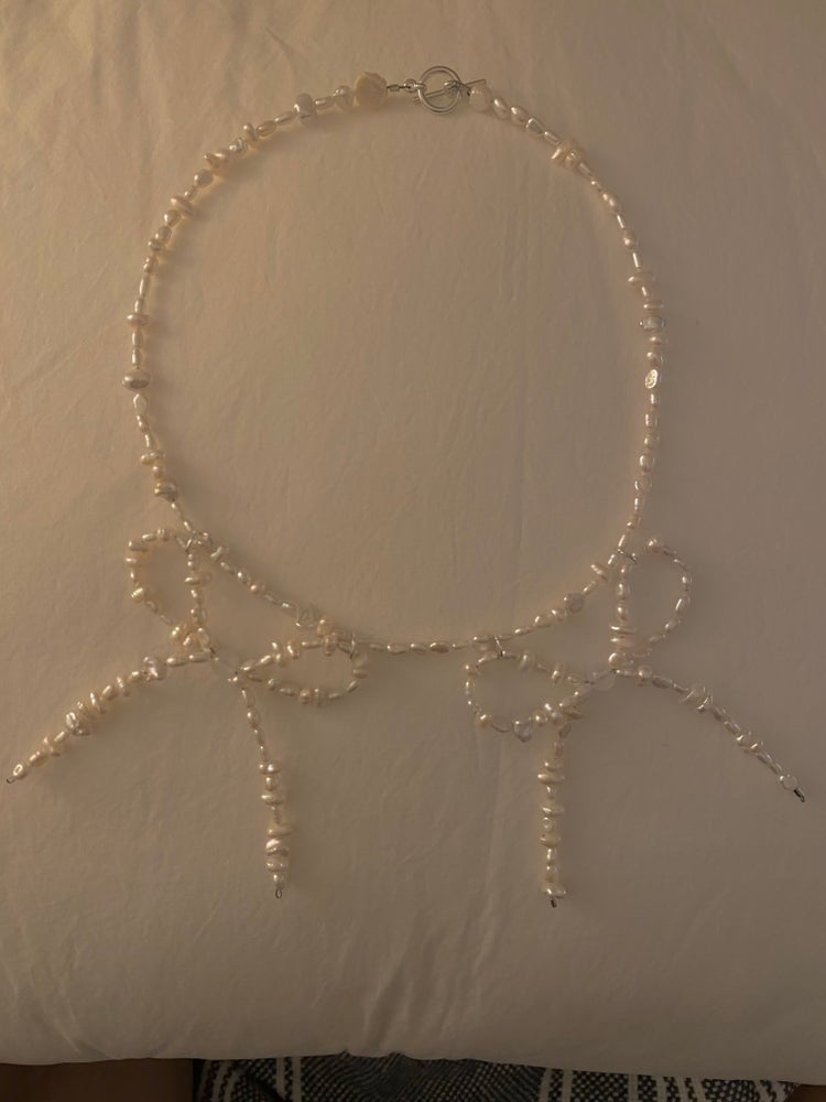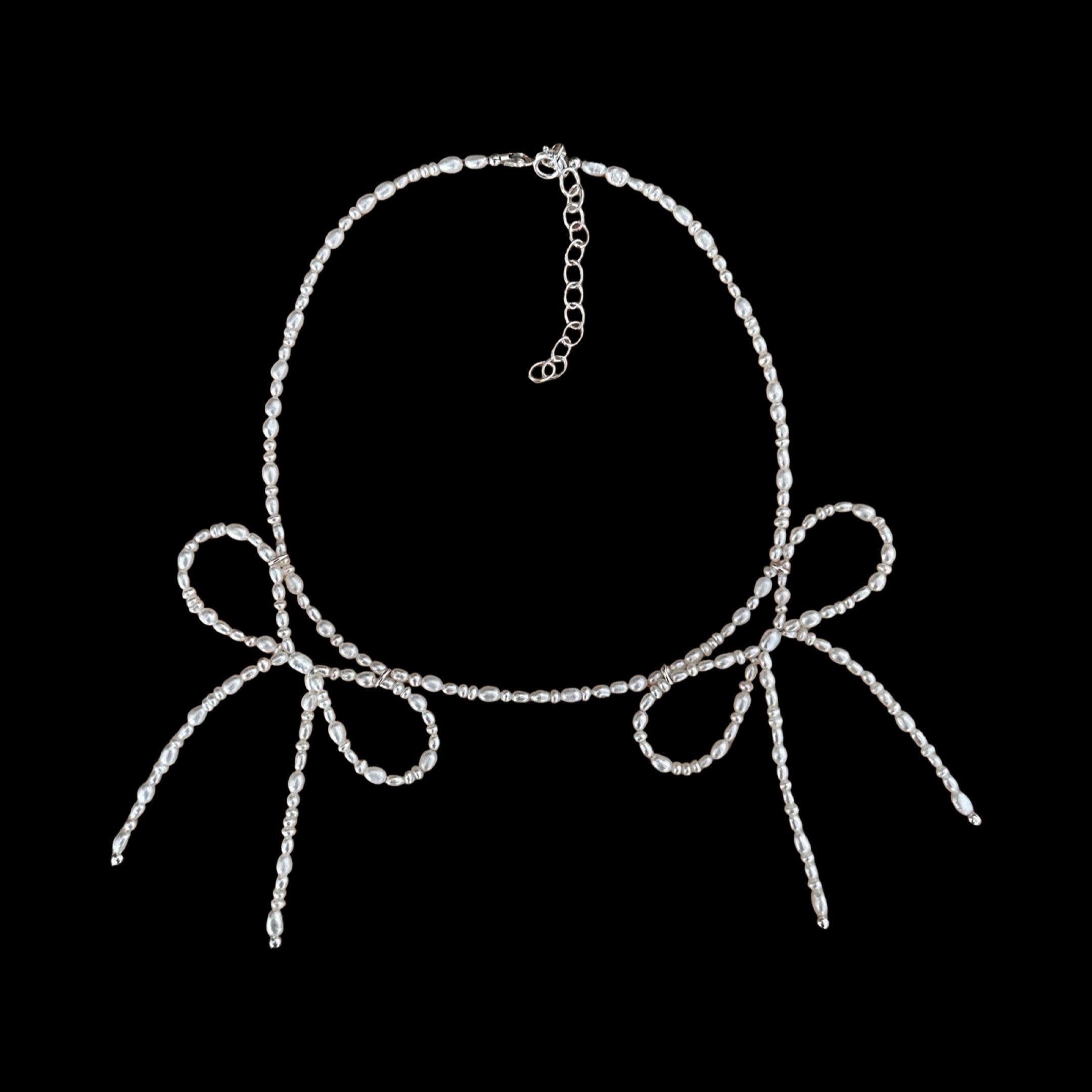 luminous pearly bows drape from a string of petite freshwater pearls