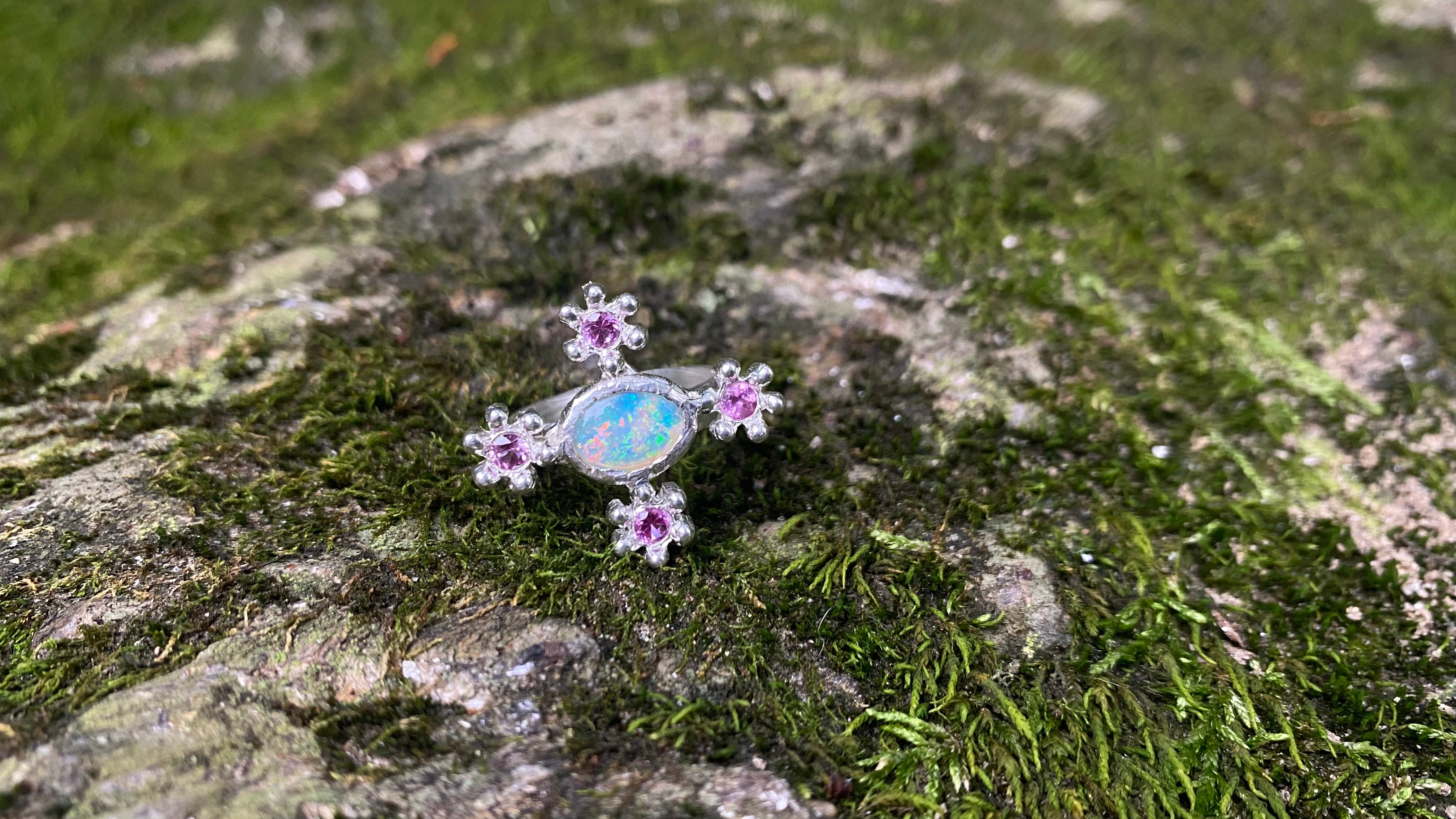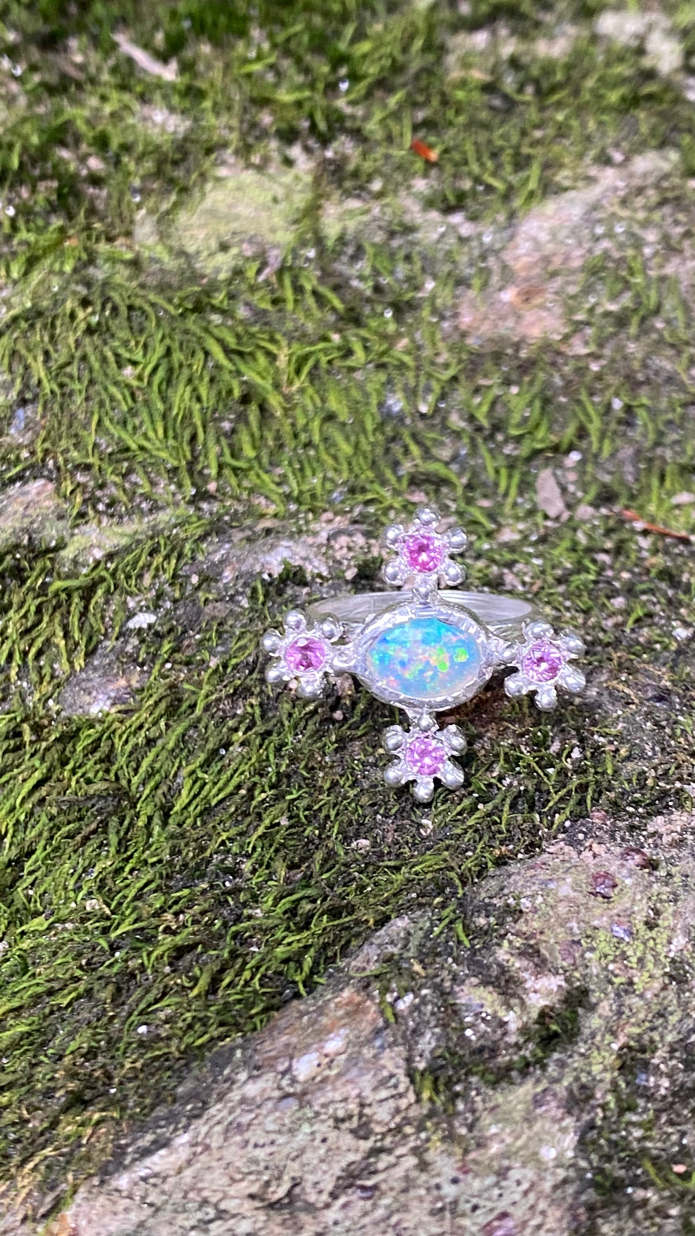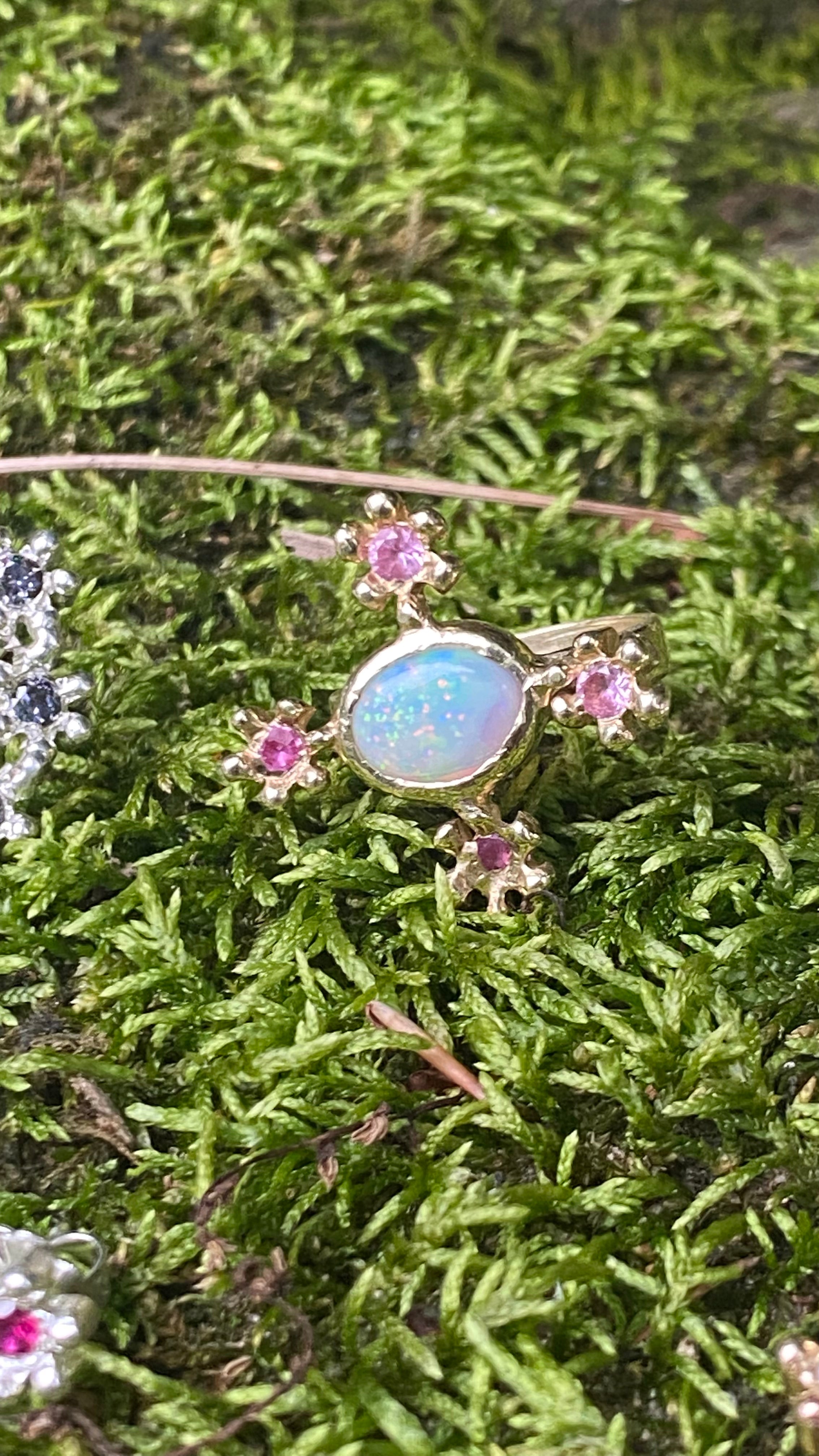9x7mm ethically mined natural Australian opal, 3mm lab made pink sapphires, metal of choice