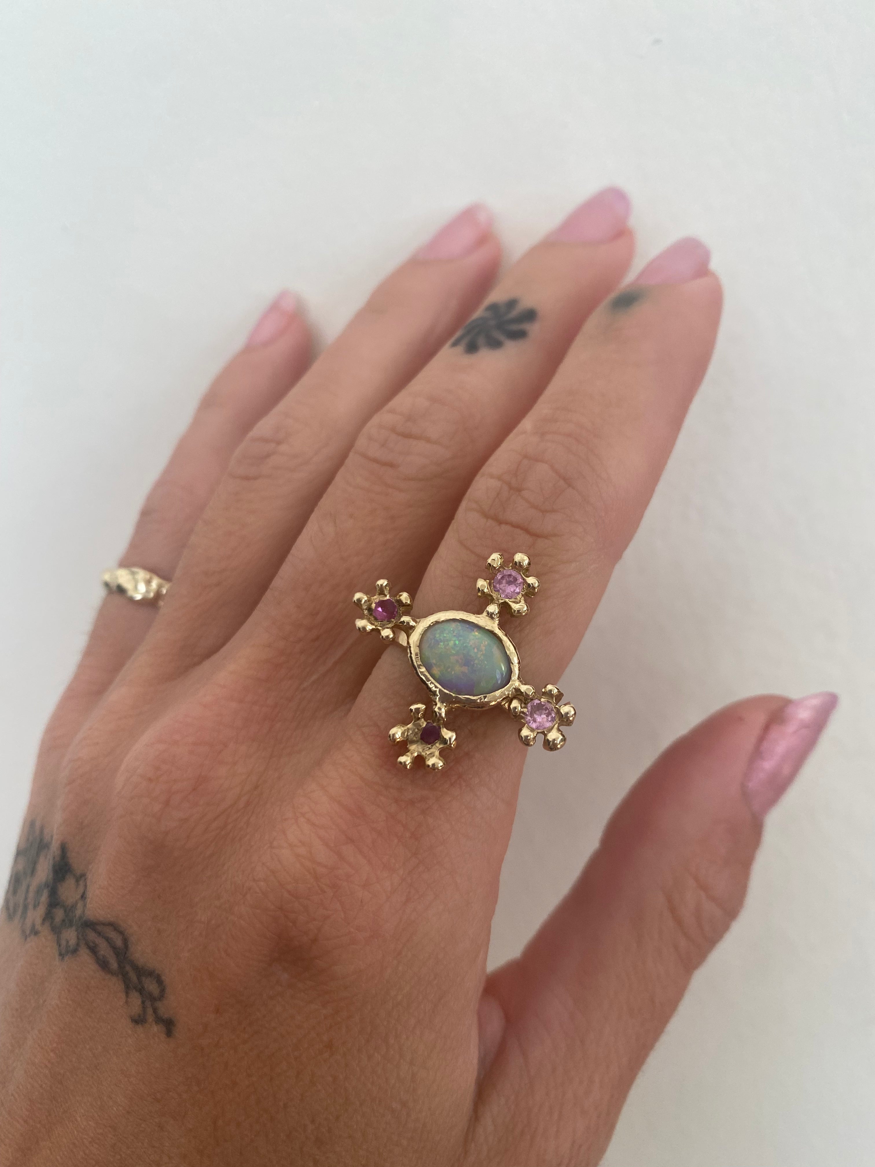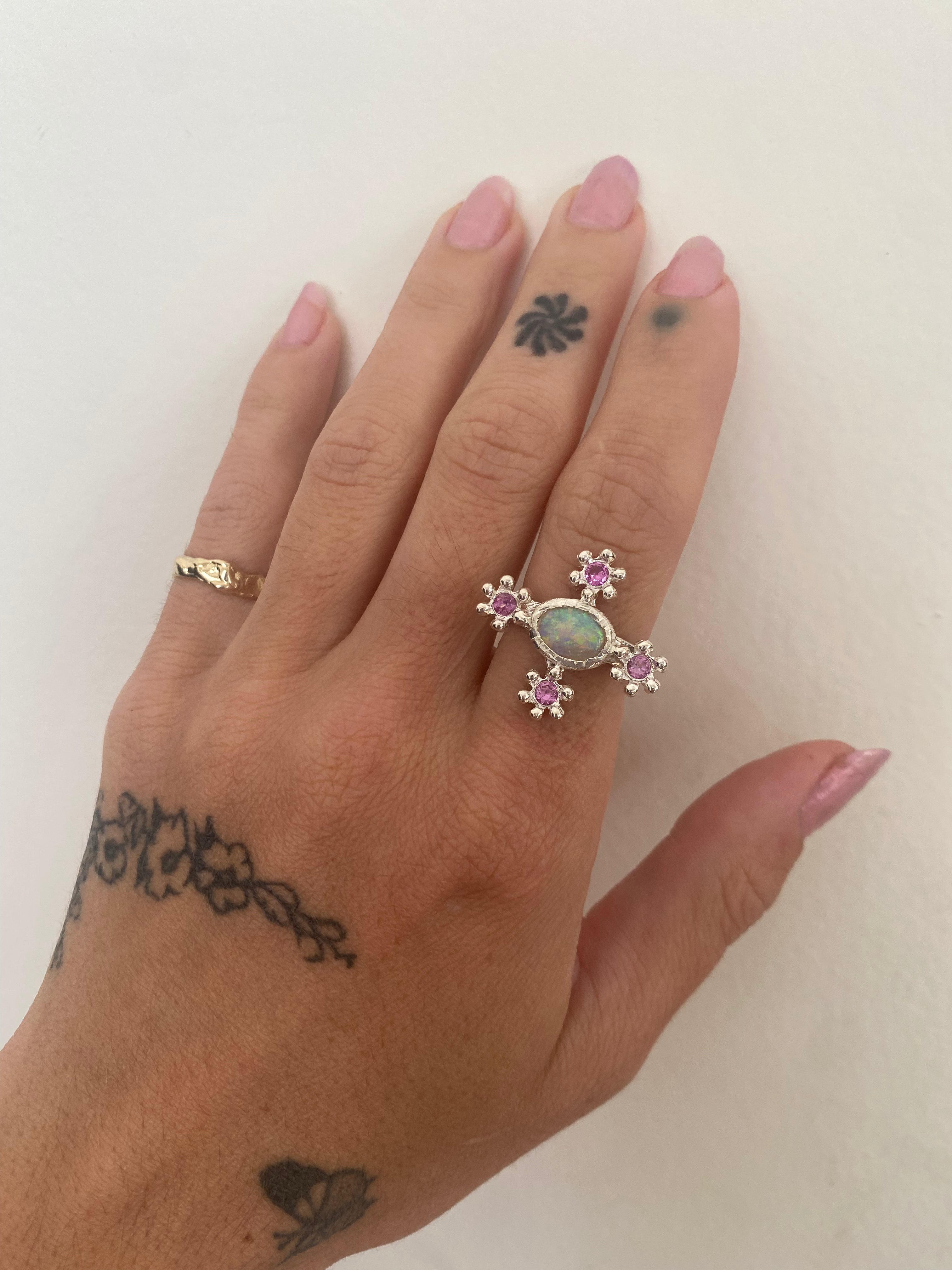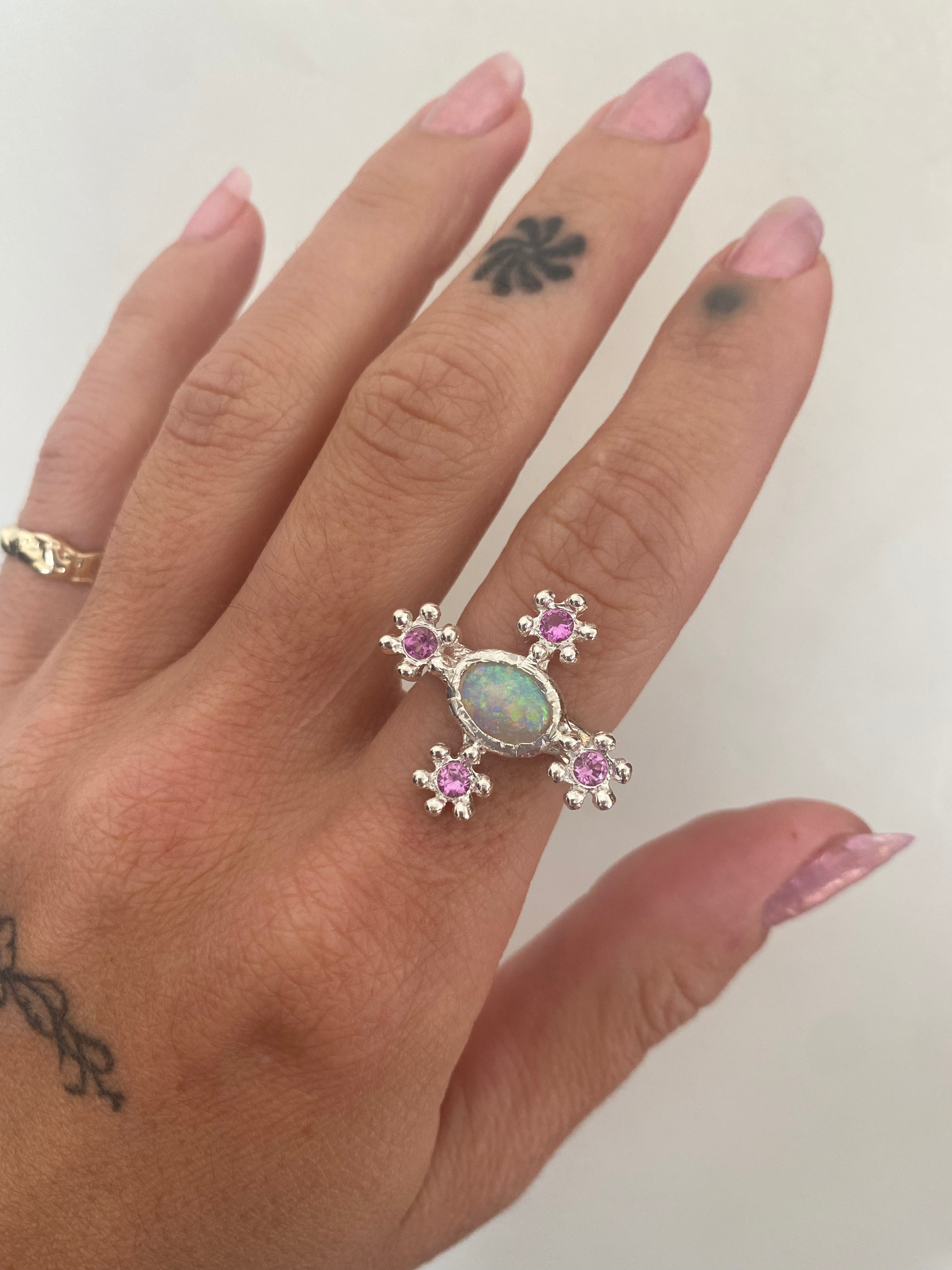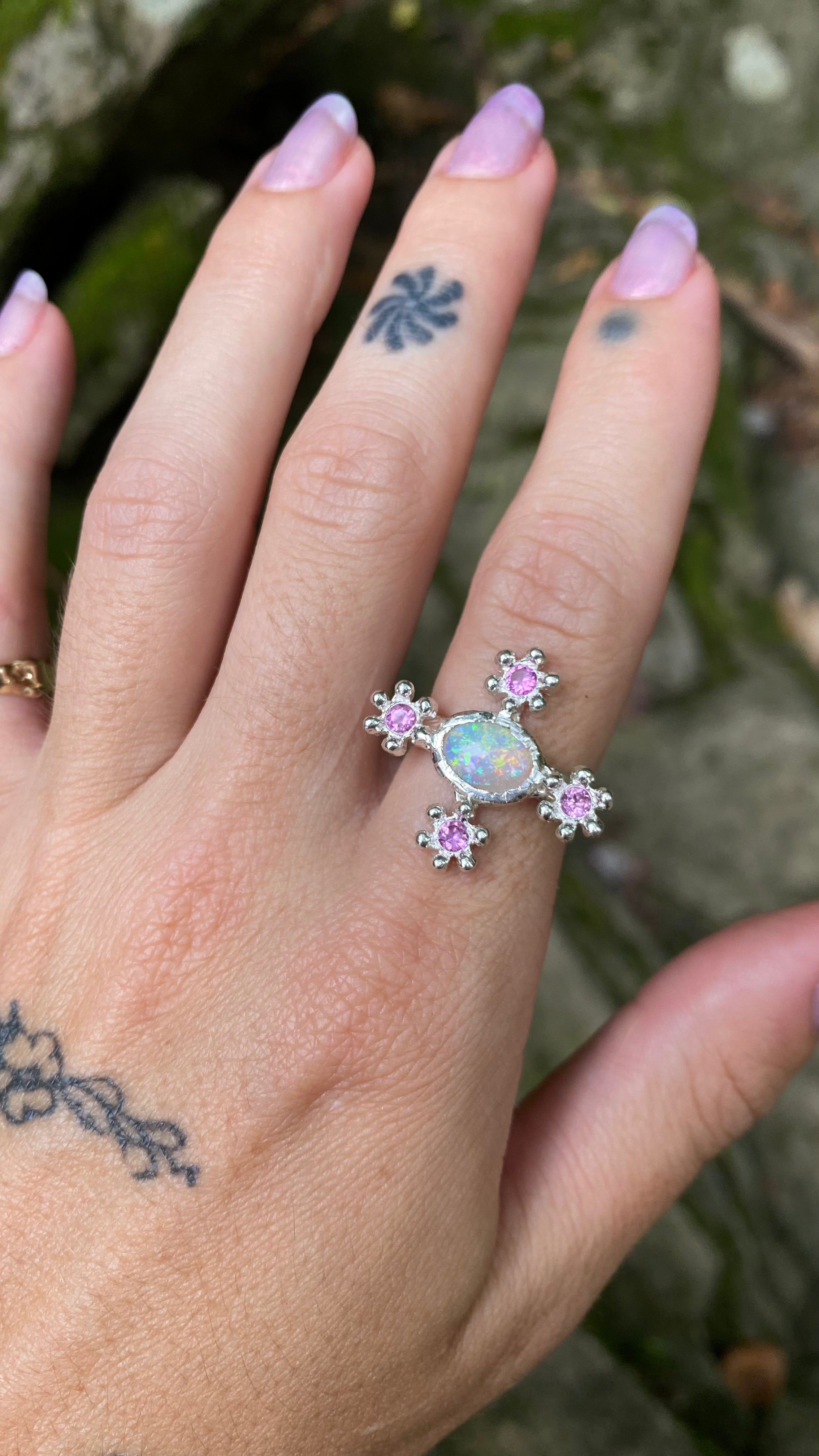 9x7mm ethically mined natural Australian opal, 3mm lab made pink sapphires, metal of choice