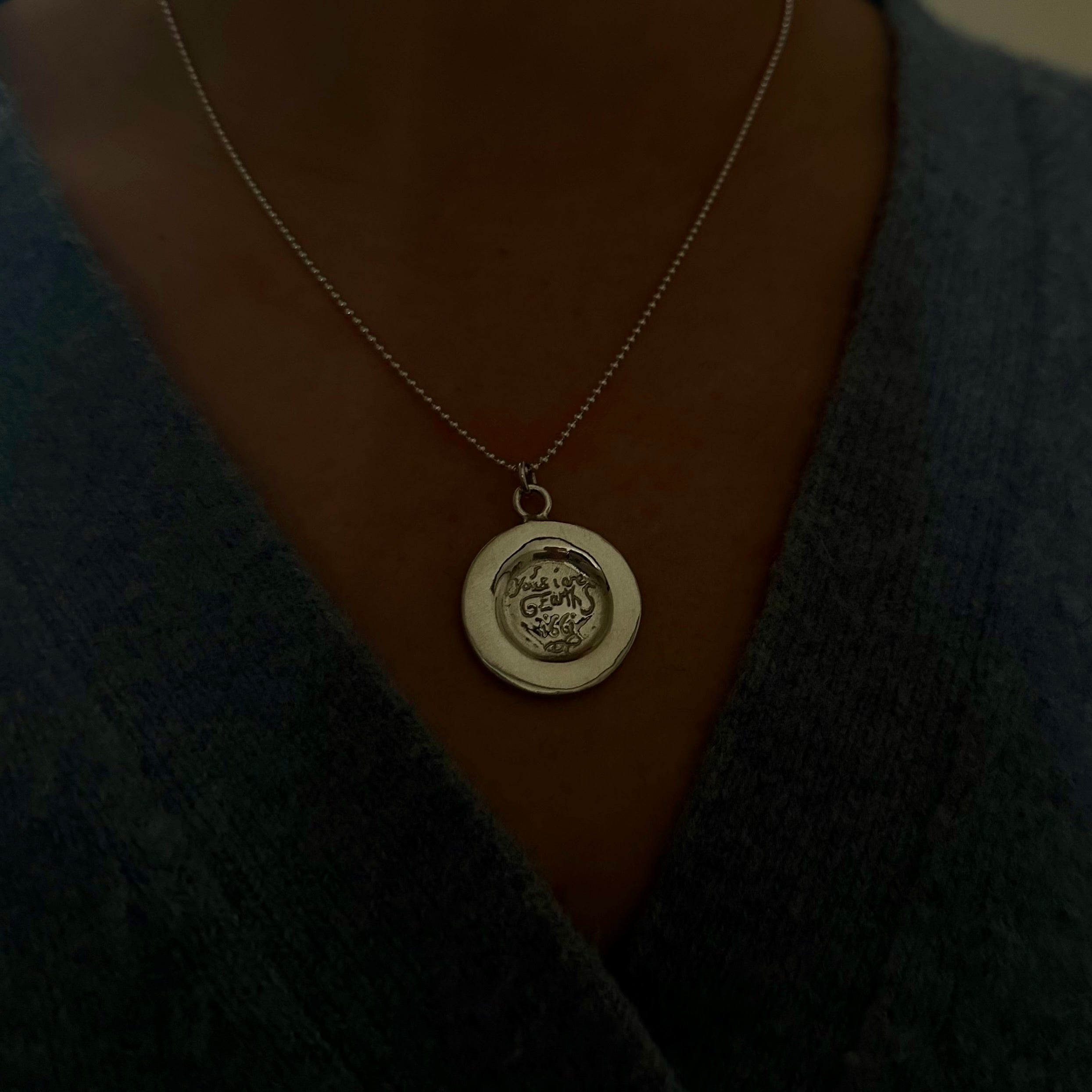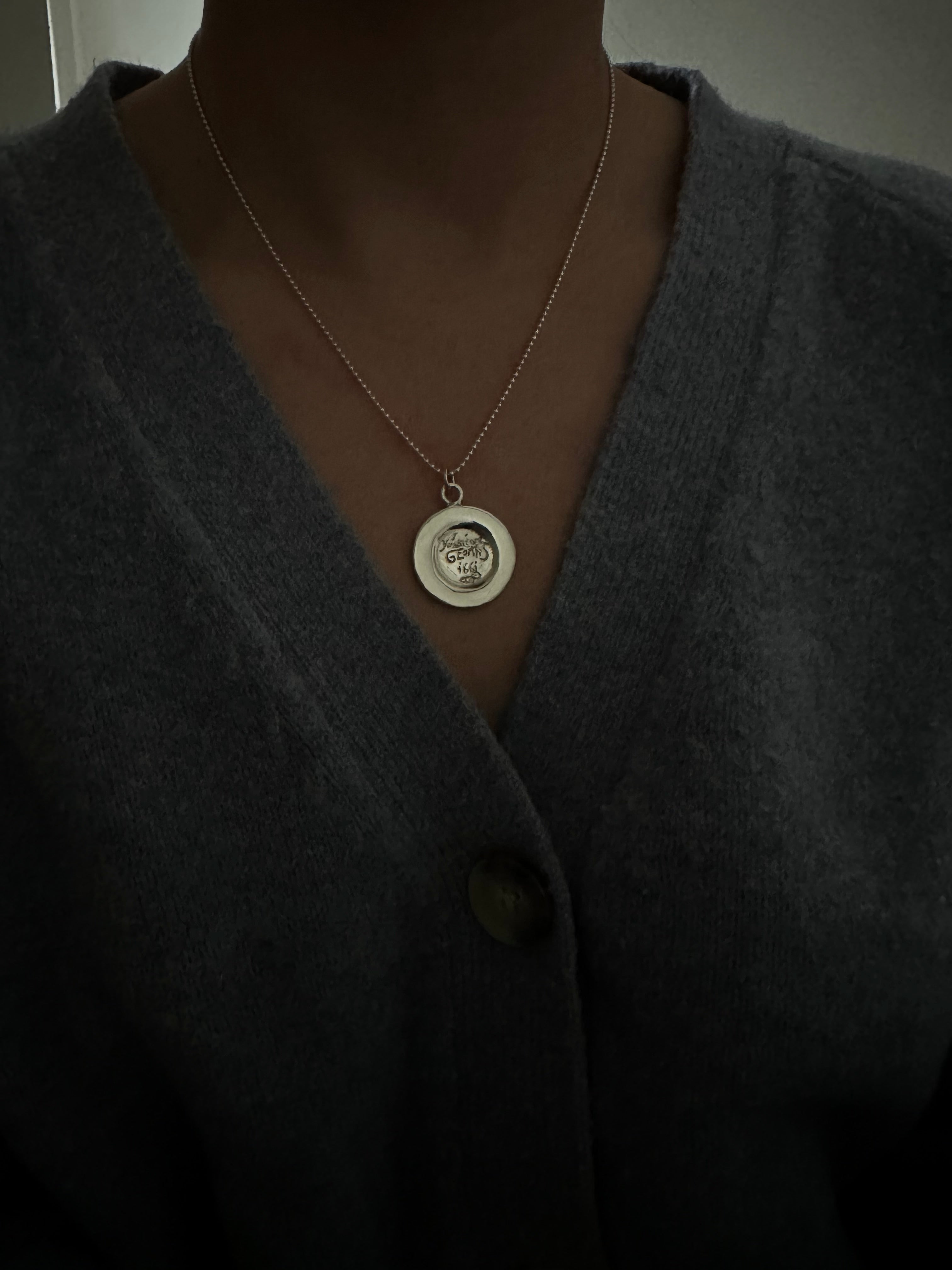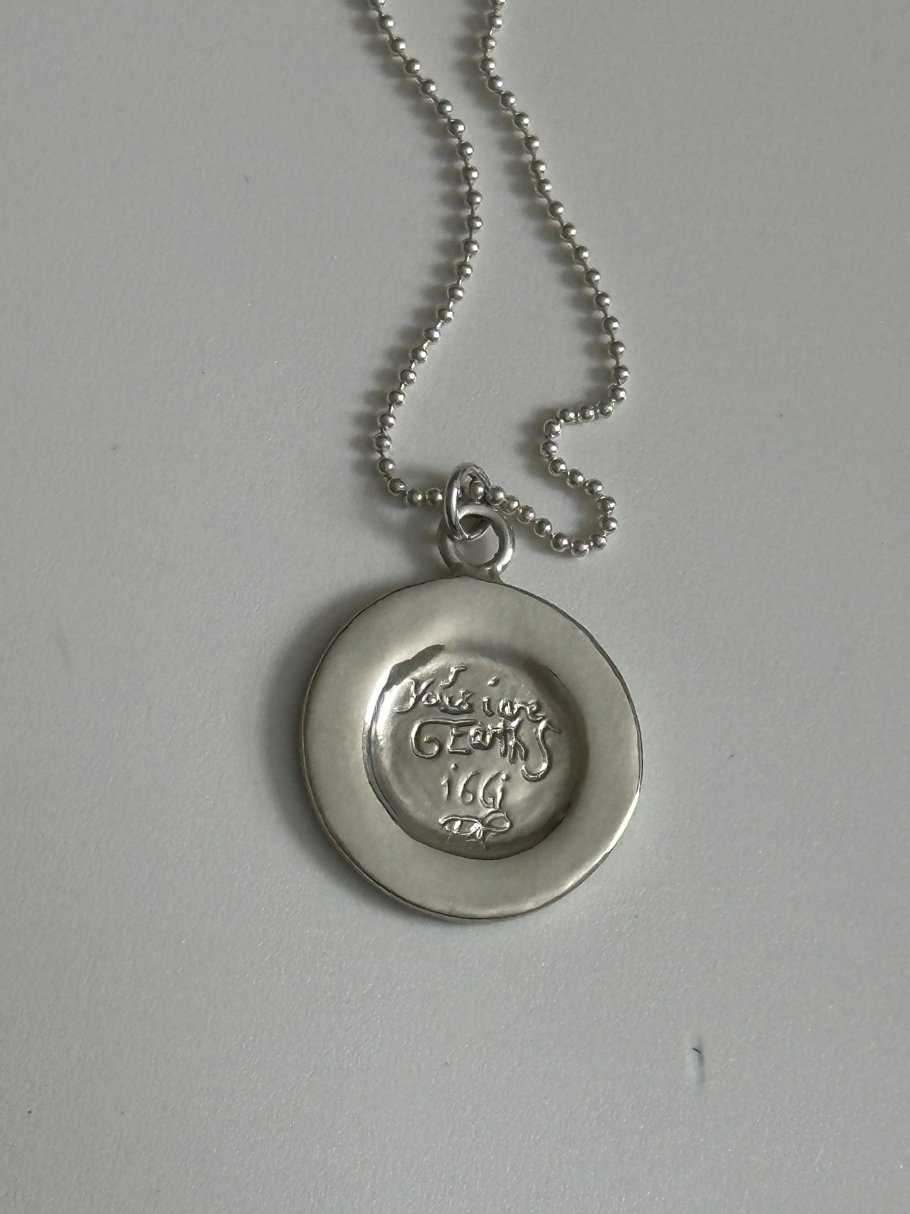 Pendant measures 1 inch, hangs from an 18 inch petite ball chain
