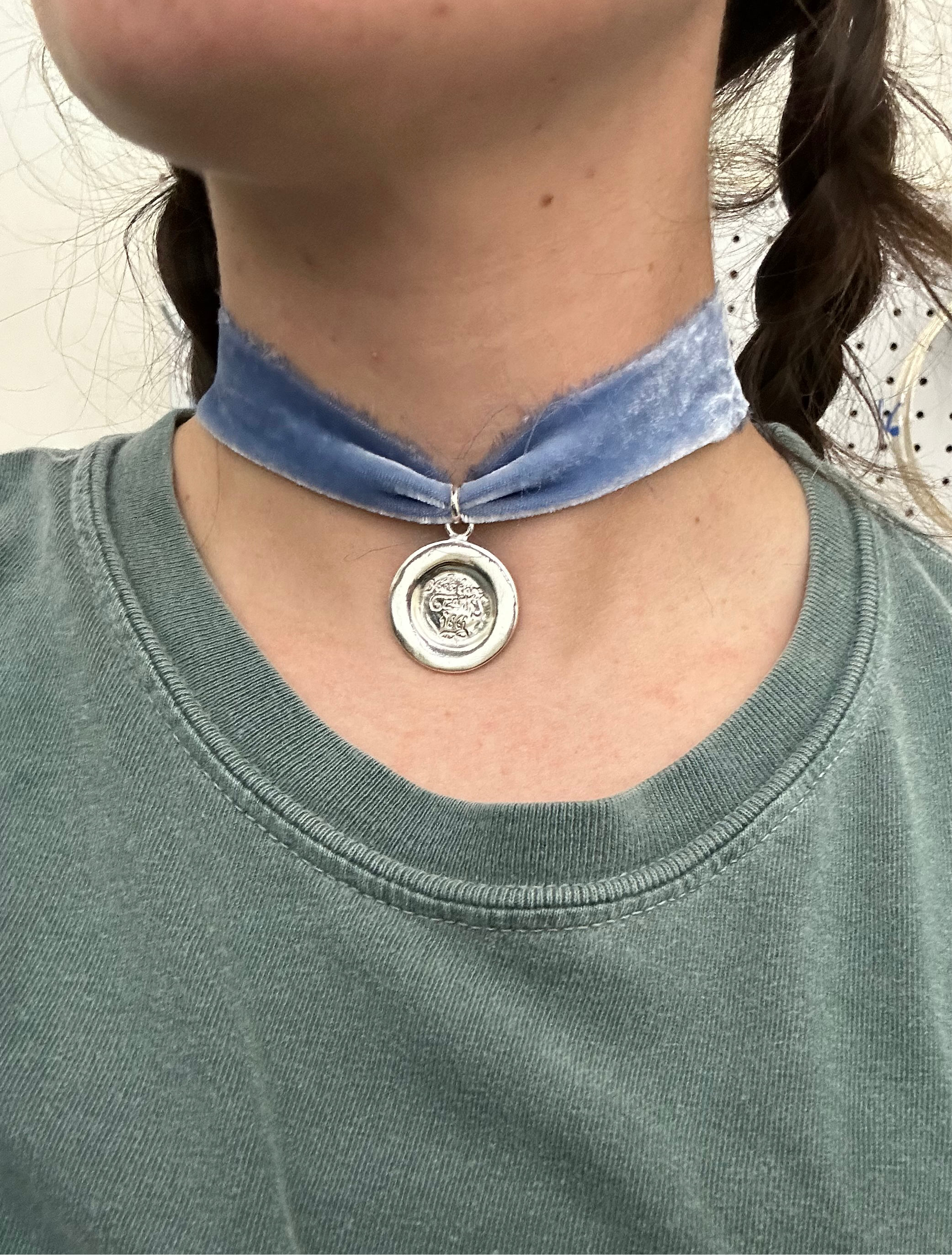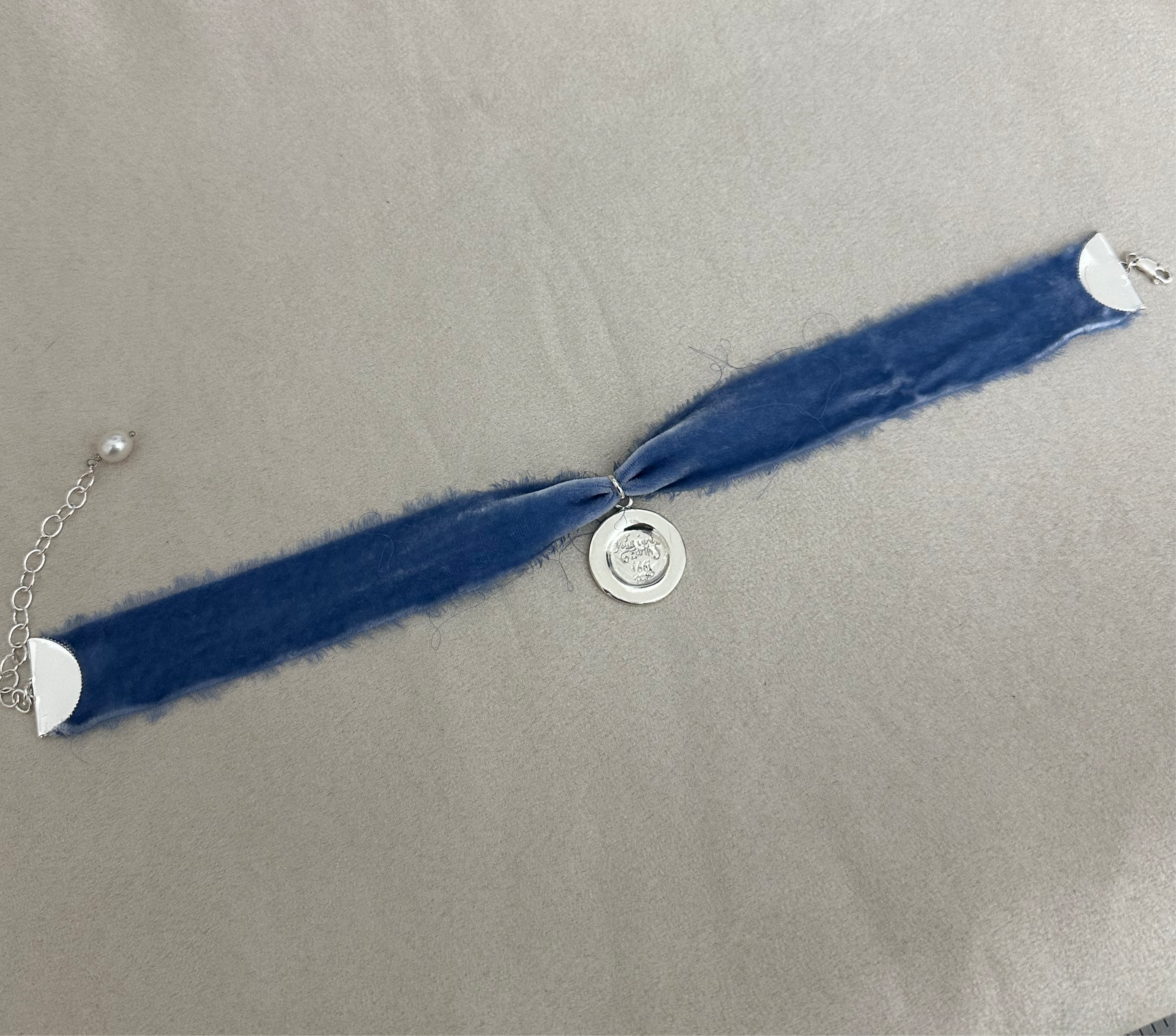 a French blue silk velvet ribbon, choker length at 12 inches with a 3 inch extender