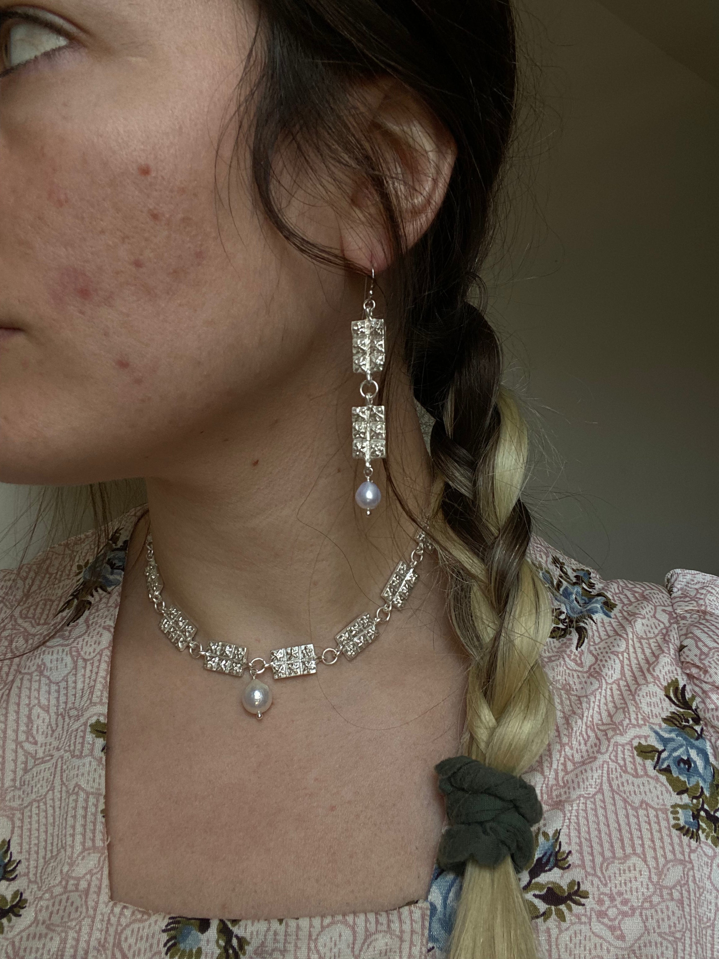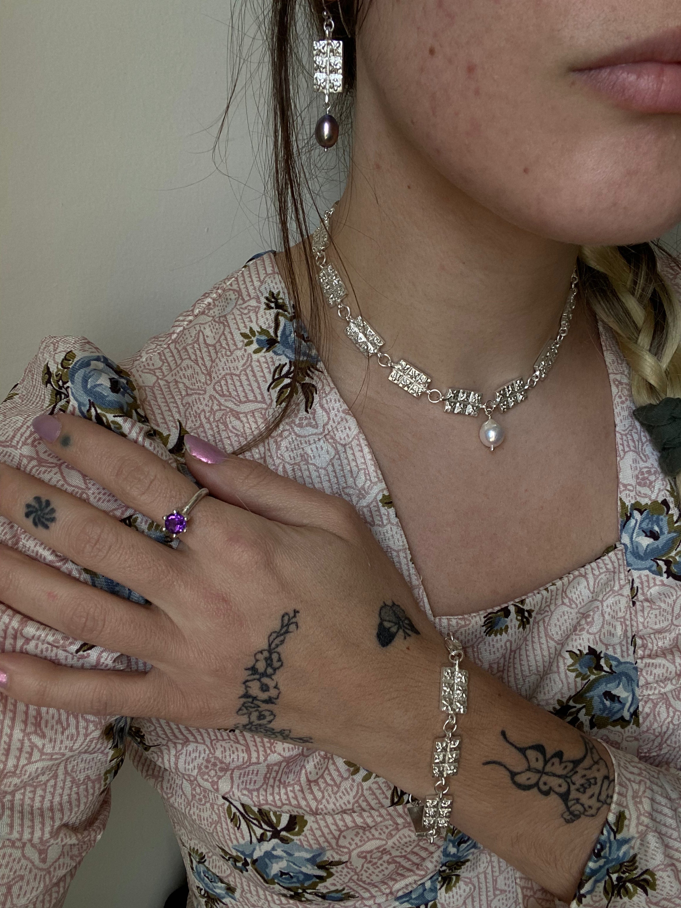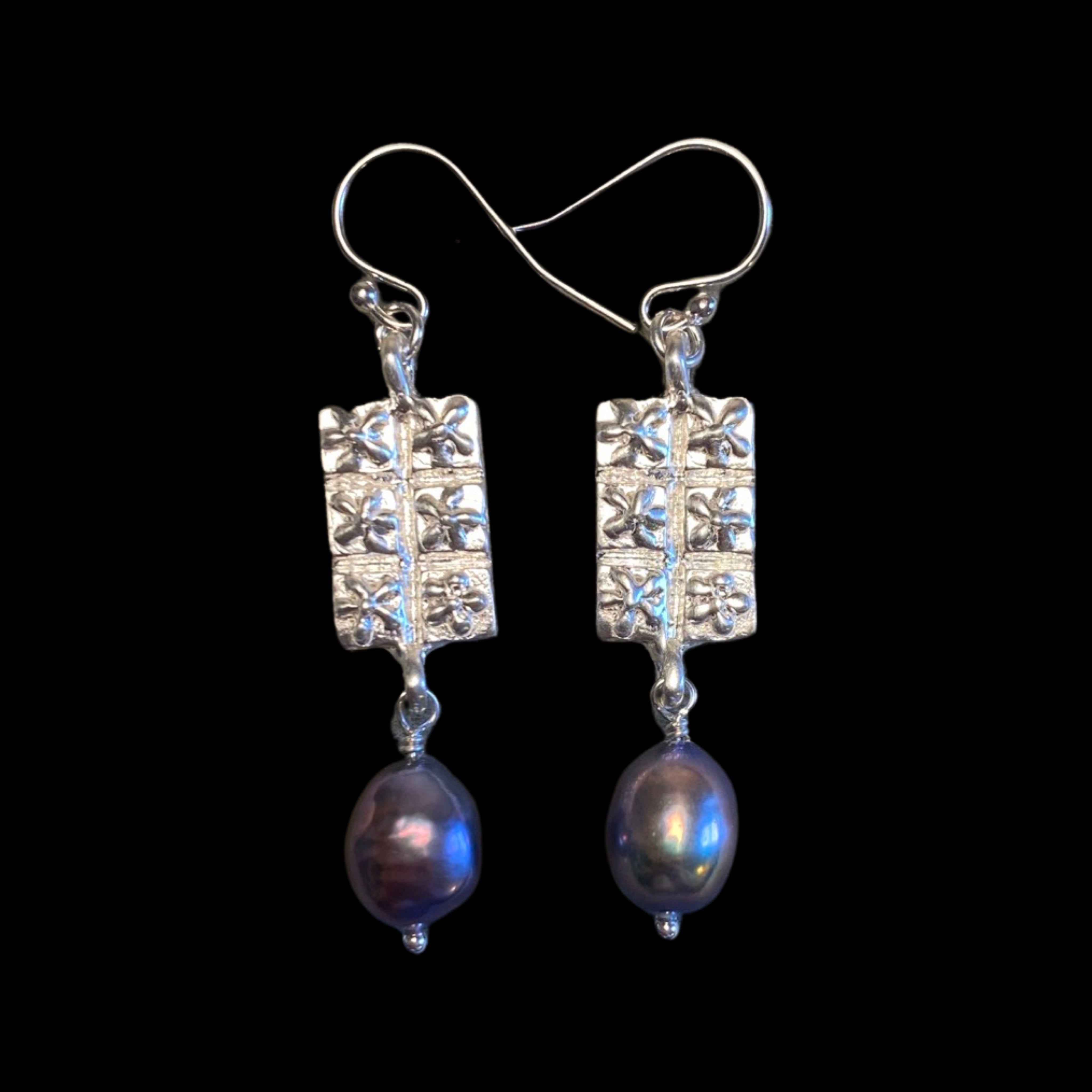 Hand sculpted tile with a flower motif, cast in sterling silver