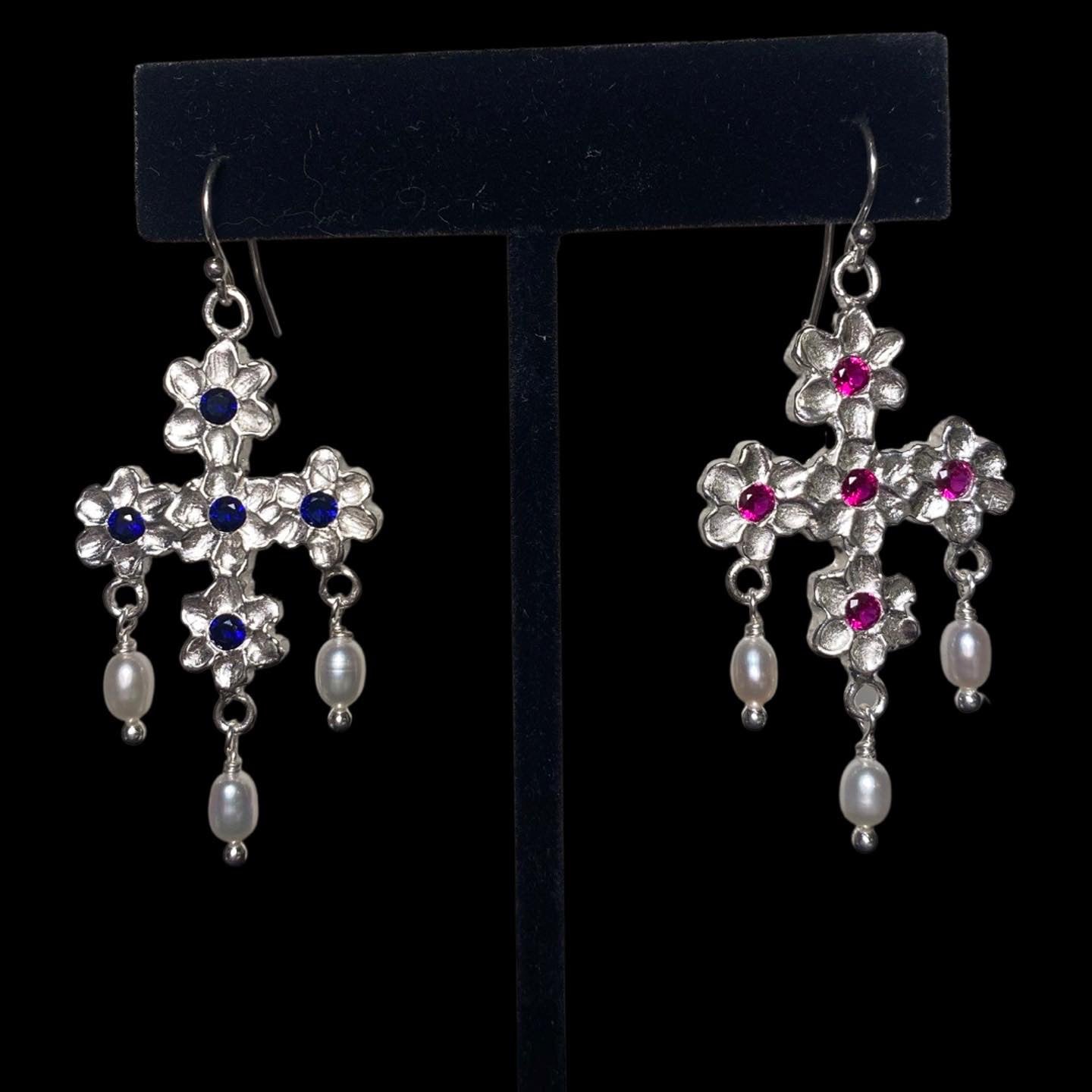 Five flowers set with gems in the center, freshwater pearls sway below,