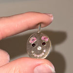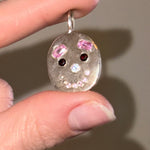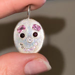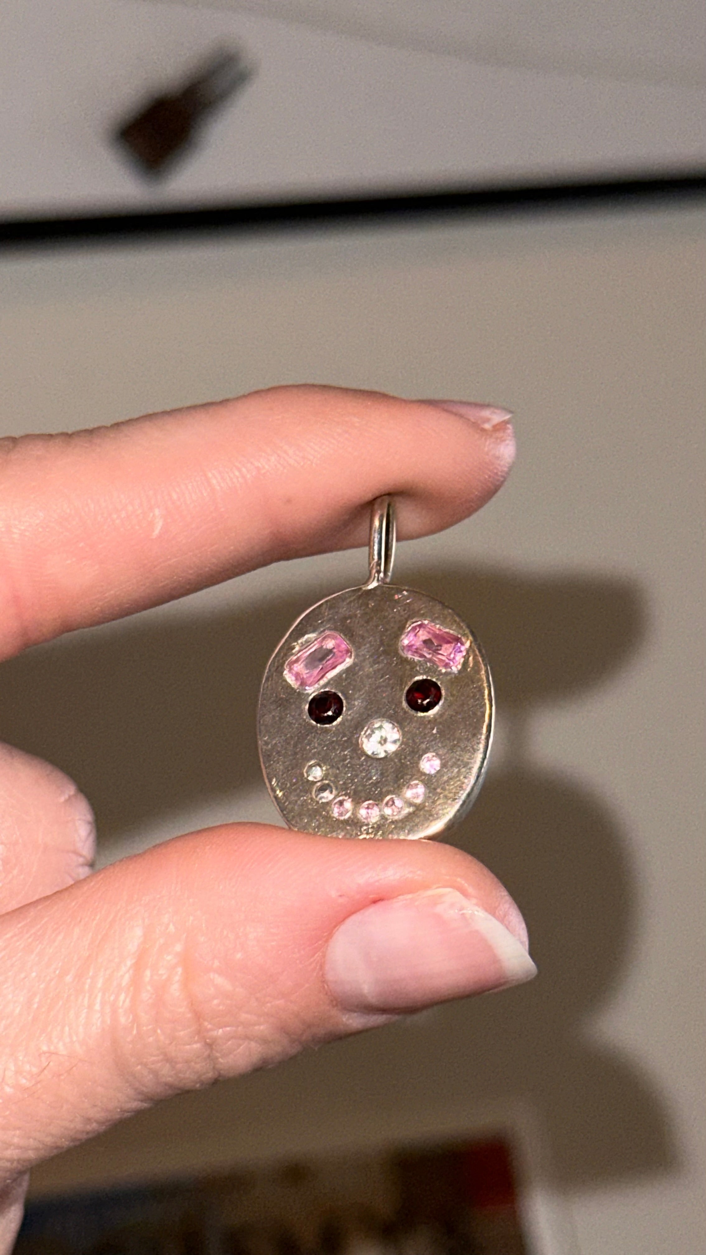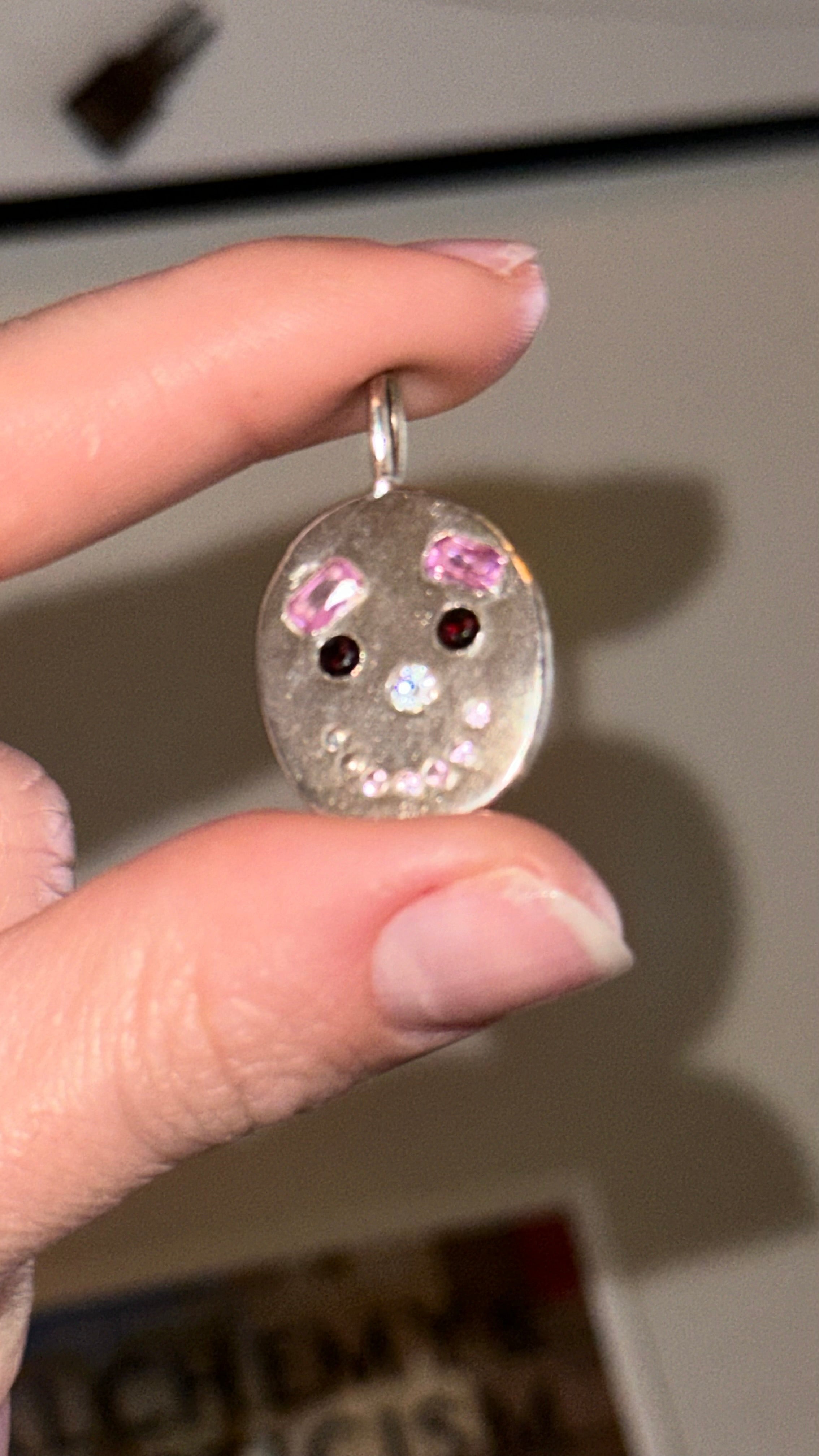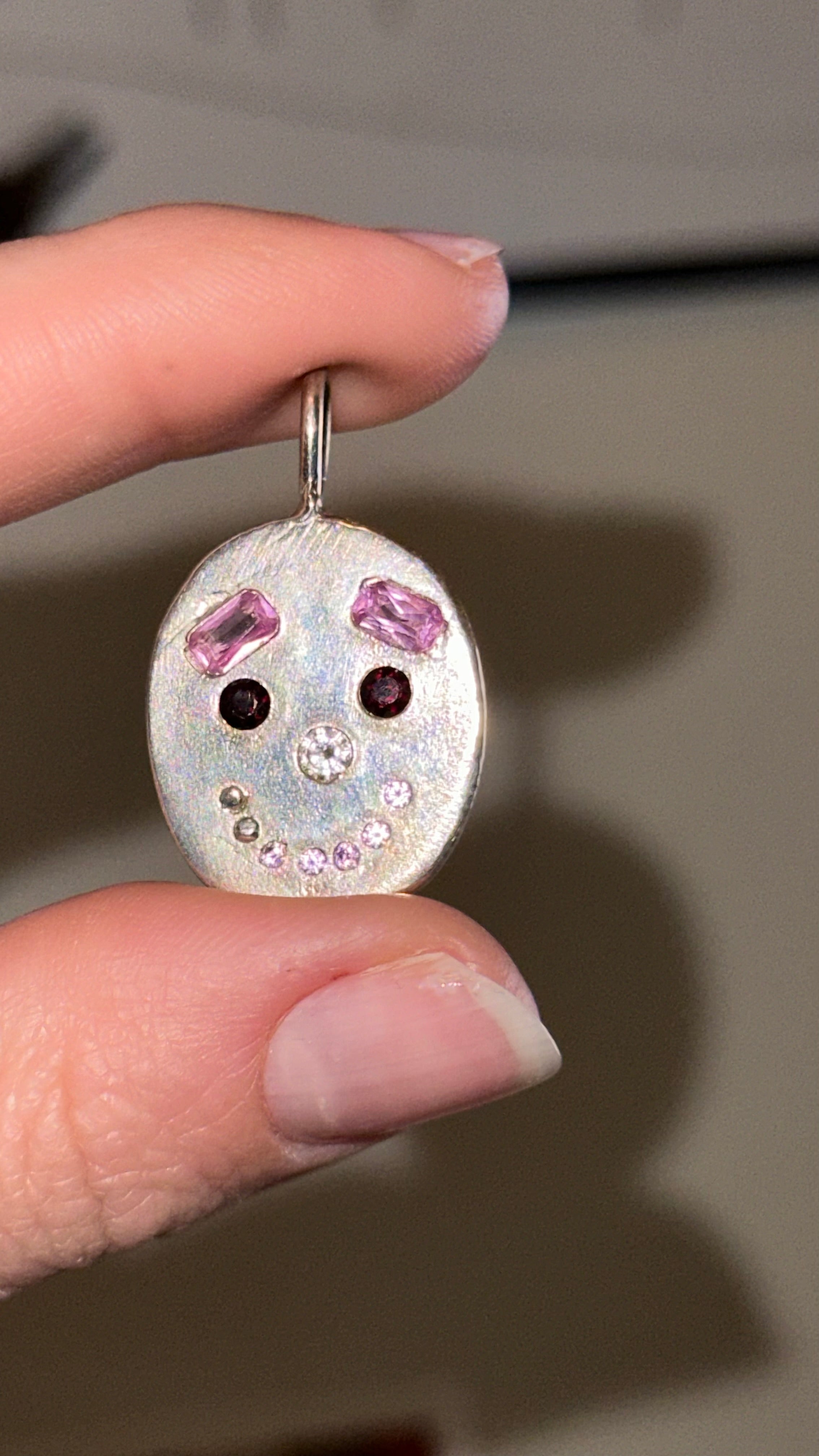 sterling silver with lab pink sapphire eyebrows, natural garnet eyes, cz nose, pink sapphire teeth