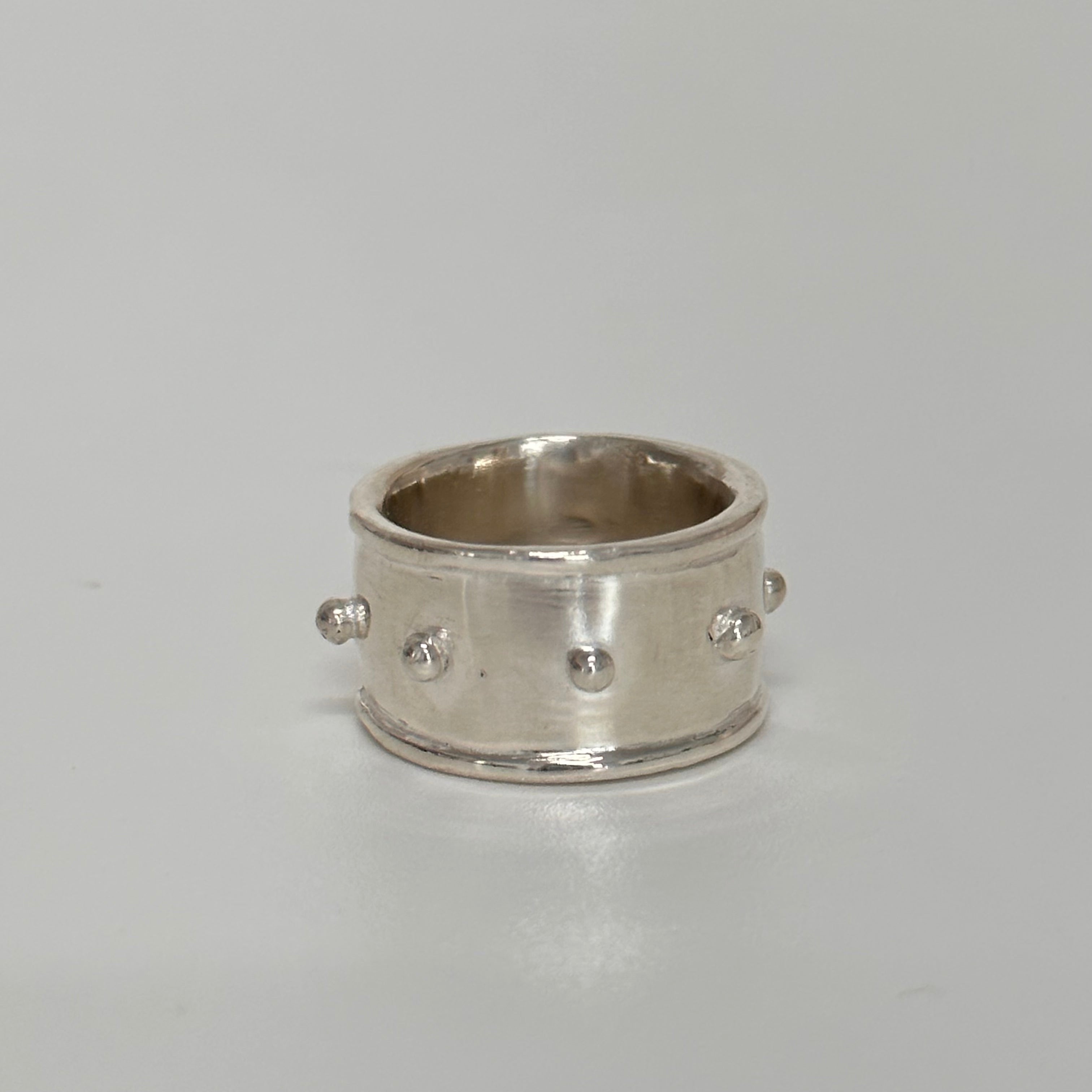 A wide ridged band encircles your finger like armor